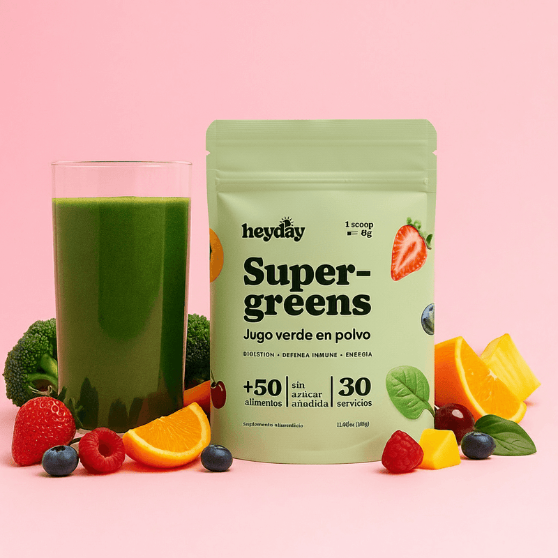 Heyday Super-Greens ayuda a aliviar la hinchazón, mejorar la digestión, refuerza tu sistema inmunológico y aporta energía. Formulado con +50 frutas y vegetales para revitalizar todo el cuerpo.